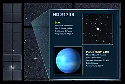 У HD 21749 известны две планеты: HD 21749 b — подтвержденная горячая экзопланета размером с Нептун и экзопланета HD 21749 c размером с Землю[10].