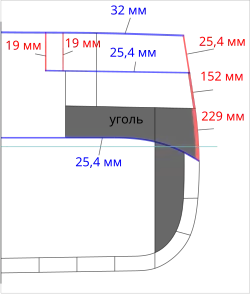 - ↑ В британском флоте толщины бронирования традиционно измеряются в дюймах. Здесь и далее все толщины переведены в метрическую систему измерения, с округлением до миллиметров. На самом деле толщина пояса 9 дюймов = 228,6 мм.