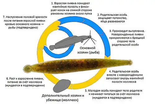 Эктопаразит. Питается кровью рыб (показано питание на ротанах, Percottus, и сомах, Silurus)[1].