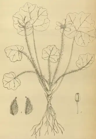 Листья прикорневые, в числе около шести, на черешках 4—12 см длиной, покрытых густым длинным опушением. Пластинка широкояйцевидная до округло-почковидной, с тремя часто слабо выраженными острыми на конце лопастями с 1—2 зубцами по краям, в основании глубоко сердцевидная, 1,5—5,5 см длиной и 2—8,5 см шириной. Молодые листья покрыты шерстистым опушением, затем оголяются. Стеблевые листья образуют чашечковидную обёртку, яйцевидные, волосистые, с тремя зубцами или цельнокрайные, 5—11 мм длиной и 3—6 мм шириной.