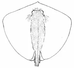 Грудные плавники этих скатов срастаются с головой, образуя ромбовидный плоский диск, ширина которого в 1,1—1,2 раза превышает длину, края плавников («крыльев») широко закруглены. Треугольное рыло формирует тупой угол, его заострённый кончик выступает за края диска. Позади среднего размера глаз расположены овальные брызгальца, которые превышают их по размеру. На вентральной поверхности диска имеются 5 пар жаберных щелей, рот и тонкие, длинные ноздри. Между ноздрями пролегает лоскут кожи с бахромчатым нижним краем. Рот изогнут в виде дуги, на дне ротовой полости присутствуют 4 отростка. Мелкие притуплённые зубы выстроены в шахматном порядке и образуют плоскую поверхность[4][6].