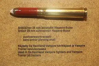 - ↑ До падения Франции весной 1940 года осуществлялась модернизация 20-мм боеприпасов «Испано». Чувствительный взрыватель оригинального осколочного снаряда фирмы Hispano-Suiza с ударником и центробежным предохранительным механизмом заменён на менее чувствительный "пневматический" взрыватель без механических частей (взрыватель этого типа также применён в 20-мм ОЗ и ОЗТ снарядах «Эрликон»). Пневматический взрыватель No 253 был дешевле в изготовлении и обеспечивал задержку в срабатывании, что позволяло снаряду внедряться на некоторое расстояние за обшивку самолёта до детонации. Этим взрывателем комплектовались осколочно-зажигательные (HEI) снаряды производства Британии и США, по крайней мере, до конца войны - см. TM 9-227 War Department Technical Manual 20-mm Automatic Gun M1 and 20-mm Aircraft Automatic Gun AN-M2 1. June 1943 Архивная копия от 25 февраля 2018 на Wayback Machine