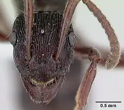 Голова шире сзади, чем спереди; мандибула треугольная с бороздками на фронтальной поверхности; передний край наличника выпуклый; скапус обычно превышает затылочный край; глаз немного позади цефалической середины; промезонотальный шов часто хорошо обозначен, полностью прерывая дорсальную мезосомальную скульптуру; проподеальное дыхальце близко к наклонной поверхности проподеума; проподеум не вооружен; передний простернальный отросток широко вогнут медиально; метакоксальная поверхность всегда с зубцом или лопастью; петиолярный узел высокий; передневентральный постпетиолярный отросток относительно широкий; второй брюшной сегмент лишь слегка изогнут вентрально. Усики рабочих и самок 12-члениковые. Жало развито[1][2].