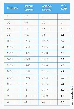 - ↑ Официальный сайт IELTS.org: Для организаций. Формат теста и результаты. Как оценивается IELTS Listening и Reading. Дата обращения: 22 июля 2013. Архивировано 27 мая 2013 года.