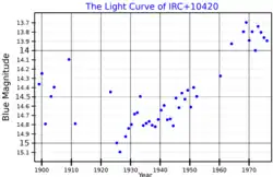 - 1 2 Klochkova, V. G.; Yushkin, M. V.; Chentsov, E. L.; Panchuk, V. E. (2002). Evolutionary Changes in the Optical Spectrum of the Peculiar Supergiant IRC +10420. Astronomy Reports. 46 (2): 139. Bibcode:2002ARep...46..139K. doi:10.1134/1.1451927. S2CID 84835394.