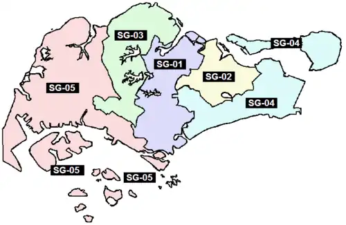 Геокоды пяти регионов Сингапура являются подмножеством кода домена верхнего уровня — SG, присвоенного Сингапуру в соответствии со стандартами ISO 3166-1.