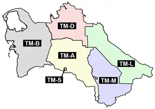 Геокоды 5 велаятов и 1 города административно-территориального деления Туркмении.