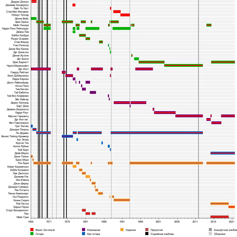 - Рон Буши — ударные, перкуссия (1966-71, 1974-77, 1978-79, 1982, 1987, 1987-88, 1993—2012, 2014—2021; один концерт — 1982; умер в 2021)