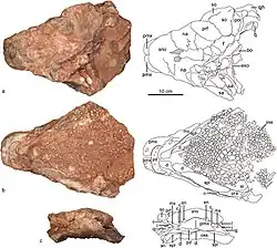 Голотип (образец ZMNH M8960) был найден в геологический слоях формации Liangtoutang, относящейся к границе верхнего и нижнего мела (альб — сеноман; около ста миллионов лет). Он состоит из частичного скелета с черепом и включает: шейные, спинные и крестцовые позвонки, частично сохранившуюся хвостовую «булаву», спинные рёбра, правую лопатку, частично сохранившуюся правую кисть, левую подвздошную кость, обе седалищные кости, левую бедренную кость, большие остеодермы и многочисленные мелкие посткраниальные остеодермы — «косточки»[1].