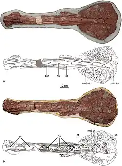 Оба скелета различаются по размеру и указывают на особей длиной от 4 до 6 метров и весом от 1 до 3 тонн.