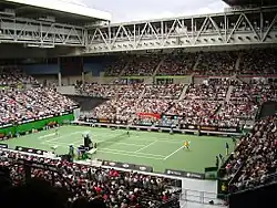 Строительство началось в конце 1990-х и было завершено в 2000 году. На арене есть велотрековая дорожка, на которой при необходимости монтируются сидячие места для зрителей. Теннисный корт имеет покрытие GreenSet (в период с 2008 по 2019 год покрытие было плексидушным), а крыша имеет возможность раздвиваться, что делает его одним из немногих мест, где можно играть в теннис во время дождя.[1]