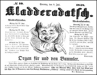 Журнал был основан берлинским либеральным юмористом Давидом Калишем, сыном еврейского коммерсанта и известным автором лёгких комедий, совместно с Эрнстом Домом и Рудольфом Лёвенштейном. Первый выпуск Kladderadatsch тиражом в 4 тысяч экземпляров увидел свет 7 мая 1848 года и был полностью раскуплен в тот же день. По случаю празднования тысячного выпуска журнала композитор Рудольф Биаль в 1866 году сочинил «Юбилейный марш Kladderadatsch». Позднее при главном редакторе Иоганнесе Трояне журнал придерживался национал-либеральных взглядов и поддерживал политику Отто фон Бисмарка.