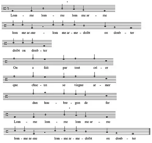 - ↑ The nearly 50 masses and a few other pieces based on L’homme armé take as their point of departure a monophonic tune that probably dates from the first half of the 15th century. (Planchart, 2003, p.306; подробное библиографическое описание статьи см. в списке литературы).