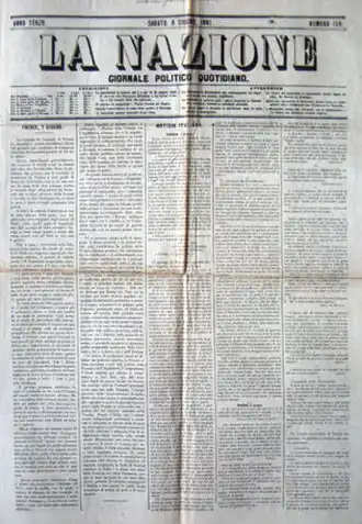 La Nazione объединилась с известной политической газетой Кавура Il Risorgimento. Базируется во Флоренции[4], Италия, публикуется в четырнадцати изданиях[5], в том числе для регионов Тосканы, Умбрии и провинции Ла Специя в Лигурии[6]. Первыми участниками были Эдмондо де Амичис, Карло Коллоди, Джованни Спадолини, Джузеппе Преццолини и Марио Луци[5].