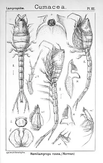 - ↑ Reyss, D. 1978. Cumacés de profondeur de l' Atlantique Tropical. Famillie des Lampropidae. Crustaceana, 35: 71-84.