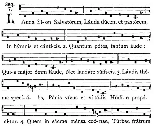 | 1. Lauda Sion Salvatorem, Lauda ducem et pastorem In hymnis et canticis. 2. Quantum potes, tantum aude, 3. Laudis thema specialis 4. Quem in sacrae mensa cenae 5. Sit laus plena, sit sonora, 6. Dies enim solemnis agitur, 7. In hac mensa novi Regis 8. Vetustatem novitas, 9. Quod in cena Christus gessit, 10. Docti sacris institutis 11. Dogma datur Christianis, 12. Quod non capis, quod non vides, 13. Sub diversis speciebus, 14. Caro cibus, sanguis potus, 15. A sumente non concisus, 16. Sumit unus, sumunt mille, 17. Sumunt boni, sumunt mali, 18. Mors est malis, vita bonis, 19. Fracto demum sacramento, 20. Nulla rei fit scissura, 21. Ecce panis angelorum, 22. In figuris praesignatur, 23. Bone pastor, panis vere, 24. Tu qui cuncta scis et vales, |