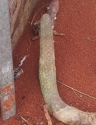 Растения формируют пучок сочных стеблей высотой 10-20 см, мало разветвленных, с бесцветным латексом. Подземные органы состоят из мочковатых корней. Сочные стебли сине-зеленые, цилиндрические, 5-30 см длиной и 20-30 мм шириной, 10-12-гранные с закругленными углами, голые. Листья стойкие, редуцированные до чешуек, сидячие; чешуи ширококонические, размером 0,05—0,1 см.