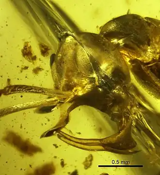 Длина около 5 мм. Длина головы 0,9 мм. Размер глаз 0,38 на 0,25 мм. Длина скапуса 12-члениковых усиков 0,94 мм. Длина груди 1,77 мм. Обладали уникальным среди всех муравьёв строением мандибул и клипеуса. Их челюсти были L-образно изогнуты вверх (имели 2 апикальных зубца) и могли двигаться в вертикальной плоскости. Обладали длинным лопатовидным выростом на голове (между местами прикрепления усиков). Этот рогоподобный вырост отходит от клипеуса (наличника), направлен вперёд и вверх, возвышается над головой. На вентральной поверхности наличника расположена пара специализированных триггерных щетинок. Ноги и усики длинные. Усики состоят из скапуса и 10 члеников жгутика.