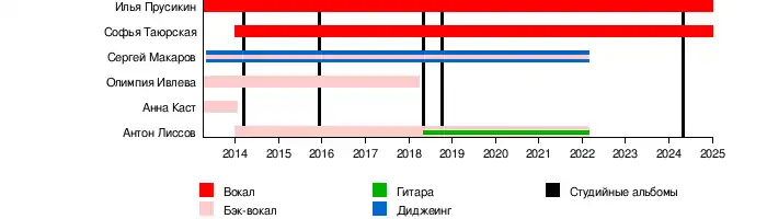 Сергей (Gokk) Макаров — диджей, бэк-вокал[10][12][13][14] Антон Лиссов — вокал[15] Олимпия Ивлева[16][17] |