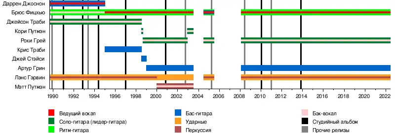 - Джейсон Траби — соло-гитара, бэк-вокал (1989—1998)