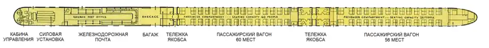 В первом, моторном, вагоне поезда размещались кабина машиниста, машинное отделение с двигателем, отсек почты, занимавший примерно половину длины вагона, и небольшой багажный отсек в хвосте вагона[1]. Во втором промежуточном вагоне размещался пассажирский салон на 60 сидячих мест, а в третьем — салон на 56 сидячих мест[1] (по другим данным — 56 и 52 места[36], или 121 место суммарно[38]). Сиденья в салоне располагались продольно по схеме 2+2 по бокам от центрального прохода лицом по направлению движения[1]. В неостеклённой хвостовой оконечности располагался буфет[36] (в остеклённом хвосте «Зефира» располагался панорамный пассажирский салон[26]). В торцевых частях пассажирских вагонов возле перехода между ними по бокам от прохода располагались туалеты[1].