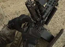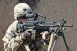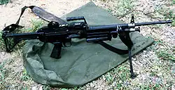 5,56-мм ручной пулемёт M249 SAW (в пер. букв. «пила», сокращение от Squad Automatic Weapon[5] — «автоматическое оружие отделения», в народе — «поросёнок») — вариант ручного пулемёта FN Minimi для армии США калибра 5,56×45 мм американского производства (производится FN Manufacturing, Inc. — местным филиалом бельгийской компании FN Herstal), серийное производство началось в 1980-х годах.