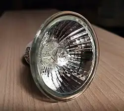 «MR» — «мультифасеточный» отражатель — означает, что рефлектор сформирован из множества мелких граней. Такие отражатели придают мягкие очертания освещаемому лампой пространству. Некоторые лампы MR16 изготавливают с гладким отражателем, позволяющим сделать световой поток более резким.