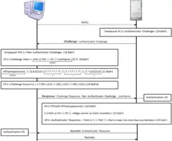- 2. Сервер отправляет обратно 16-байтовый случайный отклик «Authenticator Challenge».