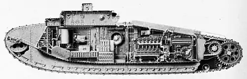 Орудийный боекомплект (208 выстрелов) размещался в боеукладках посередине танка и в передней части боевого отделения по бортам. Силовое отделение находилось изолировано в кормовой части танка. В нём располагался авиационный V-образный 12-цилиндровый мотор «Либерти» жидкостного охлаждения (343 л. с. при 1400 об\мин). На 1 машине экспериментально установили систему внутреннего и внешнего охлаждения двигателя. Это была попытка (впоследствии — удачная) устранить проблему утечек в штатной системе охлаждения, когда танки начали стареть. Этот Mk VIII сохранился до нашего времени.
