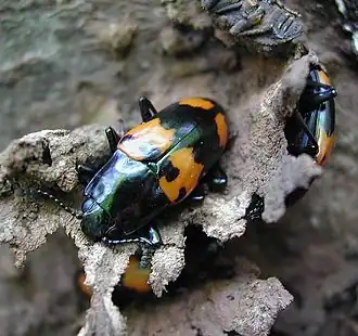 Жуки окрашены в яркие цвета с узорами.