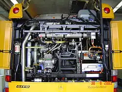 Основным силовым агрегатом является дизельный двигатель OM 904 LA мощностью 170 лошадиных сил и соответствующий стандарту Евро-2. С 2001 года автобус выпускался с улучшенным 177-сильным двигателем, соответствующий экологическому стандарту Евро-3. Двигатель автобуса располагается поперечно в задней части и приводит в движение тяговый генератор. Далее инвертор преобразует напряжение, с помощью которого электронное управление поступает на тяговый электродвигатель, соединенный через редуктор с главной парой дифференциала заднего моста. Мощность ТЭД составляет 85 кВт, вращающийся со скоростью 6000 обротов в минуту, сила тока достигает 142 А. Электрическая часть выполнена фирмой «Siemens», передний мост и основная техническая начинка — «Mercedes-Benz», задний мост — «Meritor», дисковые тормоза колес типа SB7 — «Knorr-Bremse». Обогрев салона осуществляется с помощью дополнительного отопителя фирмы «Webasto», встроенного в штатную систему охлаждения дизельного двигателя, генератора собственных нужд, компрессора и кондиционера, оснащенного ремнем генератора от основного двигателя. Радиатор охлаждения двигателя расположен в левой боковой части автобуса. Тяговое электрооборудование имеет свой жидкостный контур охлаждения с собственным насосом и отдельным радиатором с вентилятором.