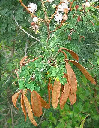 Кустарник или дерево высотой 3-8 м. Листья парно-перистые с небольшими долями. Соцветия головчатые. Плоды с 6-9 семенами имеют широкую кайму.