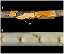 Особое внимание заслуживают кости передних конечностей. Плечевая кость птицы короткая и крепкая. Левая локтевая кость сохранилась в виде минерального слепка внутренней полости с несколькими маленькими фрагментами фоссилизированной костной поверхности. Два складчатых пятна, сохранившиеся на заднем крае тела кости, интерпретируют как перьевые бугорки. Эти удлинённые складки расположены вдоль длины кости. Несмотря на то, что осколки кости не позволяют измерить размер каждого бугорка, определить расстояние между ними или оценить количество вторичных перьев, само их присутствие на окаменелости является весьма значимым фактом. У энанциорнисовых птиц подобные структуры найдены впервые[1].