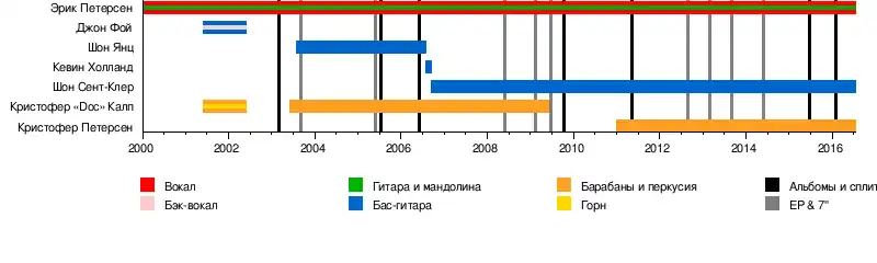- Эрик Петерсен — вокал, гитара, мандолина (2000—2016; умер в 2016)
