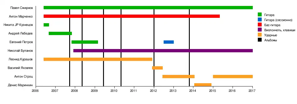 Павел Смирнов — гитара, композитор, Николай Буланов — виолончель, клавиши, композитор, Антон Строц — ударные, Илья Богомол — саксофон, Варвара Стемасова — тромбон, Олег Чернов — труба, Элина Кандрашина — альт, Мария Сулимова — рояль, Михаил Путков — вибрафон |