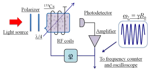 В Мх-магнитометре лазерный луч распространяется под углом 45 градусов по отношению к направлению измеряемому магнитному полю . Кроме поля , перпендикулярно к нему приложено также небольшое осциллирующее поле . Это поле навязывает фазу прецессирующих вокруг поля Во на частоте магнитного момента атомов (спинов). Проекция магнитного момента на направление распространения света прецессирующей поляризации будет оставаться постоянной до момента включения поля . Включение этого поля приведёт к изменению населённости между зеемановскими подуровнями и, как следствие, это поле вызовет модуляцию поглощения проекции магнитного момента , которое регистрируется фотодетектором, затем усиливается, фазовращателем корректируется фаза сигнала, и подаётся на радиочастотную катушку. Таким образом создается петля положительной обратной связи. Подобрав фазу сигнала добиваются генерации поля на частоте Ларморовской прецессии . Эта частота измеряется с помощью частотомера и по её величине определяют величину магнитного поля.
