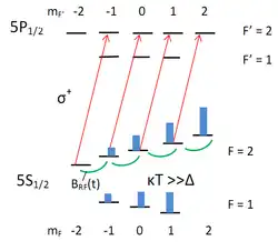 При комнатной температуре тепловая энергия атомов намного больше разницы энергий основного состояния — , поэтому согласно распределению Больцмана населённости всех уровней одинаковы, см. схему атомов рубидия Rb87. При взаимодействии атомов с оптическим полем круговой поляризации в атомном газе создается неравновесное распределение населённости атомов по зеемановским подуровням основных состояний. В результате атомный газ поляризуется и у него появляется магнитный момент .