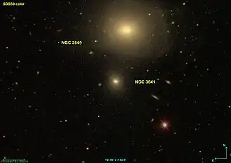 NGc 3641 относится к компактным эллиптическим галактикам, и, вероятно, она лишилась внешних областей из-за воздействия со стороны NGC 3640. В ней присутствует система шаровых скоплений, они в основном имеют красные показатели цвета[5]. На взаимодействие этих двух галактик также указывает то, что большая ось изофот NGC 3641 поворачивается на 70 градусов при переходе от внутренних ко внешним изофотам (между 7 и 40 секундами дуги). Дисперсия скоростей достигает 165 км/с в центре и спадает до 100 км/с на расстоянии в 4 секунды дуги. При этом скорость вращения в 1,5 раза превышает дисперсию скоростей, что свойственно скорее для линзовидных галактик[6].