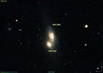 Взаимодействует с галактикой NGC 942. Новый общий каталог ясно указывает, что NGC 943 является северным объектом пары, но галактики часто путаются, особенно если север на изображениях расположен внизу. Пара NGC 942 и NGC 943 используется Атласом пекулярных галактик в качестве примера «неклассифицированной» галактики[4].