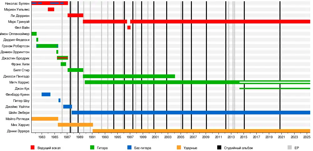 - Шейн Эмбёри — бас-гитара (1987 — настоящее время)
