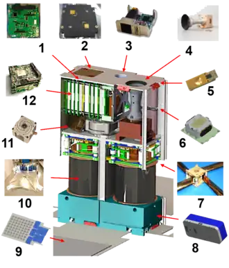 В модуле авионики размещались печатные платы блоков связи, распределения питания, системы управления и обработки данных, а также солнечный и звёздный датчики. Этот модуль также включал маховики, литиевые батареи и камеру[7]. Система управления ориентацией состояла из трех исполнительных подсистем: системы управления маховиками, системы управления двигателем и системы управления положением центра масс[19].