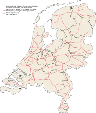 Железные дороги покрывают практически всю территорию страны и соединяют все крупные города. Интенсивность движения на большинстве участков сети — две пары поездов в час; на наиболее загруженных участках — не менее четырёх пар поездов в час. Самая большая интенсивность — 12 пар поездов в час в пиковое время — в начале 2009 года была на участке Гаага — Роттердам. Поезда курсируют между 06:00 и 24:00, при этом на участке Роттердам — Гаага — Амстердам — Утрехт организовано ночное движение поездов (одна пара в час, останавливаются не на всех станциях).