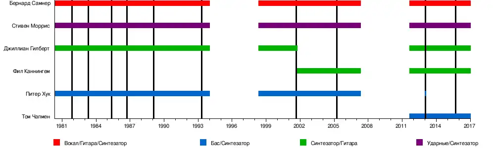 - Бернард Самнер — ведущий вокал, гитара, синтезатор, музыкальное программирование (1980—1993, 1998—2007, 2011—наши дни)