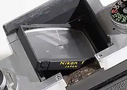 Кроме различных типов пентапризм на фотоаппарат могли устанавливаться шахта и специальный тип призменного видоискателя Action Finder, позволяющий наблюдать полный кадр с расстояния до 40 мм от окуляра большого размера[41][42]. Все видоискатели Nikon F механически полностью совместимы с камерами Nikon F2, в то время как для установки пентапризм F2 на корпуса модели F требуется удаление шильдика, закреплённого на камере двумя винтами[30]. Однако в последнем случае экспонометр пентапризмы оказывается неработоспособным, поскольку Nikon F2 предусматривает питание от батареек, располагающихся в корпусе фотоаппарата, тогда как в модели F элементы питания встроены в корпус видоискателя[* 5].