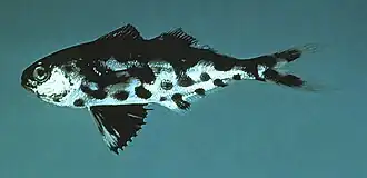 Рыба с яркими темно-синими пятнами на серебристом теле. Рыбы как правило не встречается вдали от этих сифонофор. Пищей португальских корабликов состоит из мальков рыб, которых они убивают стрекательными клетками на ловчих щупальцах.