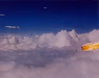 Когда самолёты, пробив облачность, выстроились для съёмки, F-104, летевший справа от «Валькирии», задел своим левым крылом за опущенную законцовку правого крыла бомбардировщика, перевернулся через его фюзеляж, отбив ему оба киля, ударился о левую консоль и взорвался — произошедшее удалось запечатлеть на фотографии.