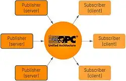 Сначала стандарт OPC UA обеспечивал связь только по модели клиент/сервер. Клиент делает запрос (Request) какой-либо информации и получает ответ (Response) от сервера. Такая архитектура имеет ограничения в сетях с большим количеством узлов. Архитектура «издатель — подписчик» позволяет осуществить коммуникацию один-ко-многим и многие-ко-многим. Сервер отправляет данные в сеть (Publish), и получить их может любой клиент (Subscribe). Расширение PubSub OPC UA позволяет передавать данные, используя транспортный протокол MQTT. Взаимодействие по такой модели в сочетании с поддержкой TSN позволило также использовать технологию OPC UA в промышленных приложениях, требующих строгой синхронизации времени. Технология была успешно испытана на опытных установках таких организаций, как Консорциум промышленного интернета (англ.) и Labs Network Industrie 4.0 (LNI).[11]