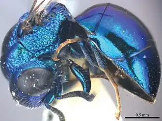 Мелкие осы-блестянки с коротким и широким телом (3,3-3,9 мм). Длина передних крыльев 2,6-3,2 мм. Основная окраска синяя, лапки коричневые (усики чёрные). Пунктировка груди не глубокая. Жгутик усика посредине не утолщенный. Жвалы трёхзубчатые. Коготки с 3 зубцами. Задний край третьего тергита брюшка с вырезкой. Брюшко блестящее. Гнездовые паразиты одиночных ос (Crabronidae)[1].