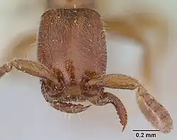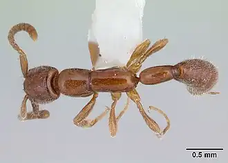 Длина рабочих около 2—4 мм (самки до 5,72 мм). Усики 12-члениковые. Глаза и оцеллии у рабочих отсутствуют (у самки есть и глаза и три оцеллия). Петиоль без переднего стебелька, вдвое длиннее своей ширины. Тело светло-коричневое. Абдоминальный сегмент VII самый длинный в брюшке, на котором имеется длинное загнутое кверху жало[1][2][3].