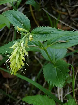Многолетнее травянистое растение высотой 10—35 см. Стебли прямостоячие или чуть повислые, морщинистые, слегка опушённые. Листья 3—7 см длиной и 1,5—3 см шириной. Край листа с каждой стороны изрезан на около десять зубцов.
